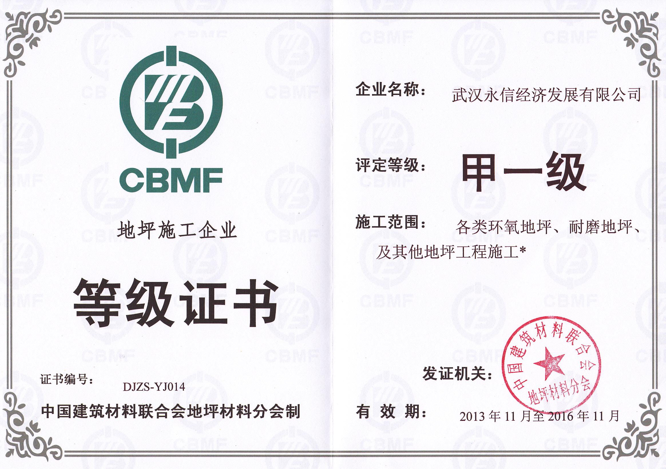 在公司領(lǐng)導(dǎo)帶領(lǐng)和正確指導(dǎo)下,經(jīng)公司全體員工共同努力,我司先進(jìn)的施工工藝和優(yōu)質(zhì)工程成果,榮獲中國(guó)建筑材料聯(lián)合會(huì)地坪材料協(xié)會(huì)頒發(fā)的“甲一級(jí)”證書。讓永信以更完美的姿態(tài)迎接地坪行業(yè)領(lǐng)域日新月異的挑戰(zhàn)。