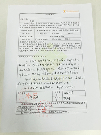 感謝襄陽(yáng)卷煙廠總務(wù)科領(lǐng)導(dǎo)對(duì)我公司回訪工作的支持,襄陽(yáng)卷煙廠改造項(xiàng)目是由我公司主要負(fù)責(zé)的地坪專(zhuān)業(yè)工程,產(chǎn)品包括合金耐磨地面、聚氨酯砂漿(UCRETE MF)、聚氨酯自流平(MT1324)、地下停車(chē)場(chǎng)環(huán)氧橘紋系統(tǒng)等,涉及面廣,施工難度大,在湖北中煙襄陽(yáng)卷煙廠各級(jí)領(lǐng)導(dǎo)的督促下,順利完成襄陽(yáng)卷煙廠的改造項(xiàng)目,并且此項(xiàng)目還獲得了魯班獎(jiǎng)的殊榮。隨著地坪種類(lèi)的不斷豐富,應(yīng)用領(lǐng)域的不斷擴(kuò)大,地坪工程質(zhì)量已經(jīng)成為地坪行業(yè)持續(xù)發(fā)展的關(guān)鍵。一個(gè)優(yōu)質(zhì)的地坪工程產(chǎn)品,不再僅僅是面層材料選用和施工,更重要的是地面整體系統(tǒng),即面層+基層的整體方案設(shè)計(jì)與施工。武漢永信地坪用多年的經(jīng)驗(yàn)和口碑得到了客戶(hù)的認(rèn)可、得到了中國(guó)建筑材料聯(lián)合會(huì)地坪分會(huì)的官方認(rèn)證。武漢永信地坪將繼續(xù)致力于引進(jìn)更加綠色、節(jié)能環(huán)保的新型建材,用我們自己的產(chǎn)品為我們代言!